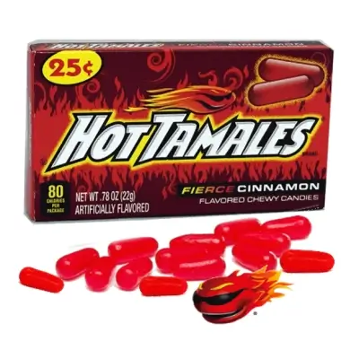 Hot Tamales to cukierki do żucia o smaku ostrego cynamonu! Przygotuj się na ciekawe w buzi doznania smakowe powstałe w połączeniu szczypiącego i rozgrzewającego smaku cynamonu.