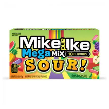 Mike and Ike Mega Mix Sour to kolorowe cukierki zrobione z prawdziwych soków z owoców. Są małe, miękkie, gumiaste i przede wszystkim - kwaśne! Każde pudełeczko wypełnione jest owocowo - kwaśnymi cukierkami aż w 10 smakach: kwaśne jabłko, kwaśną truskawkę, kwaśną krzyczącą wiśnię, kwaśną soczystą cytrynę, kwaśną zieloną limonkę, kwaśny poncz pucker, kwaśny ananas mocy, kwaśny arbuz Wipeout, kwaśną sodę winogronową i kwaśną szokującą malinę!
