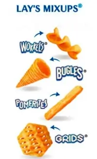 Lay's Mixups Fromage to mieszanka chipsów Fritelle, Wokkels, Grids i rożków 3D's o smaku serowym. Jednym słowem - przekąska idealna dla wszystkich wielbicieli serowych przekąsek, która dzięki swojej różnorodności nie nudzi się podczas jedzenia!